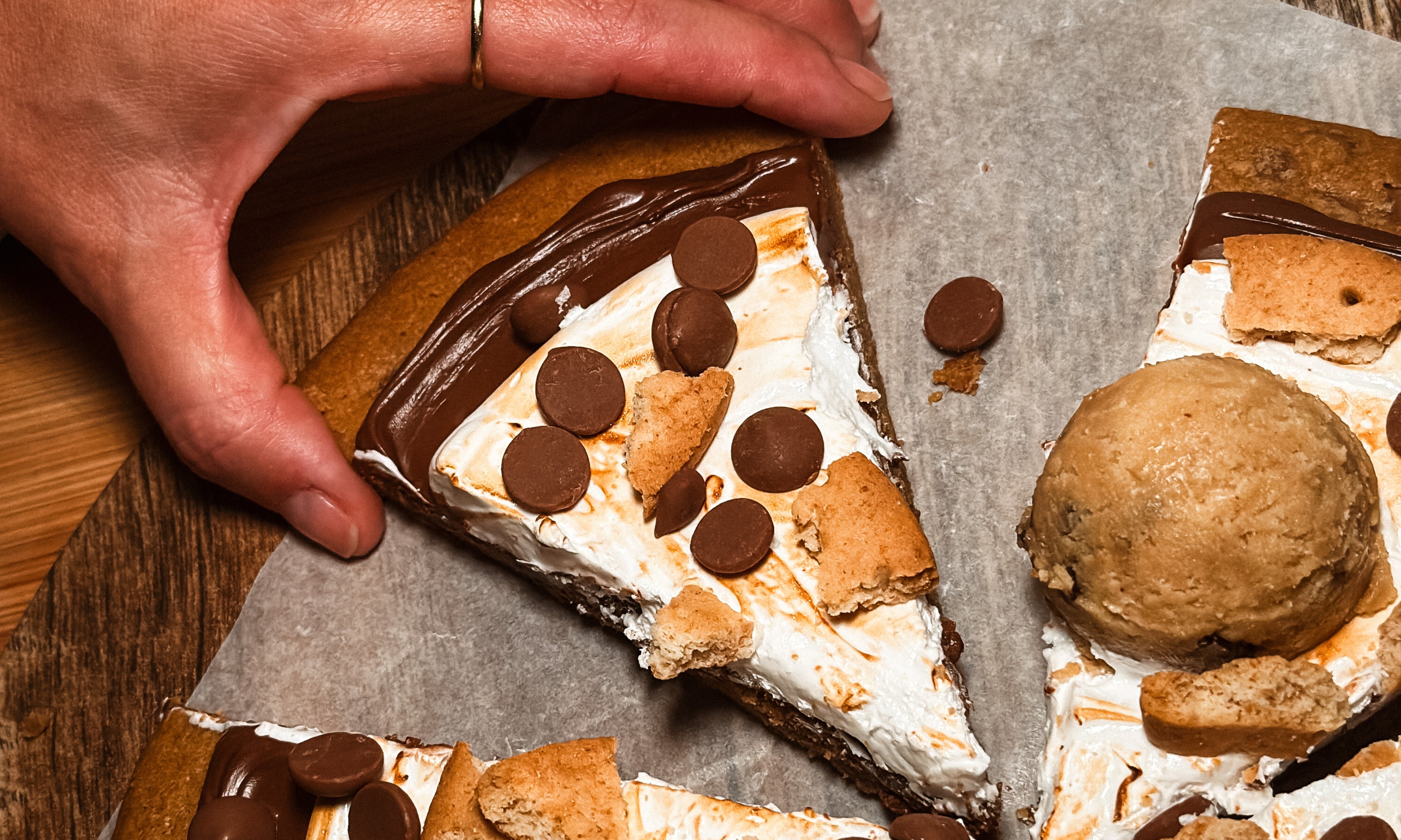 Cinnamon dough + milk chocolate + Nutella® + torched marshmallow fluff + edible cookie dough biscuit chunks. Best consumed same day (8 slices)